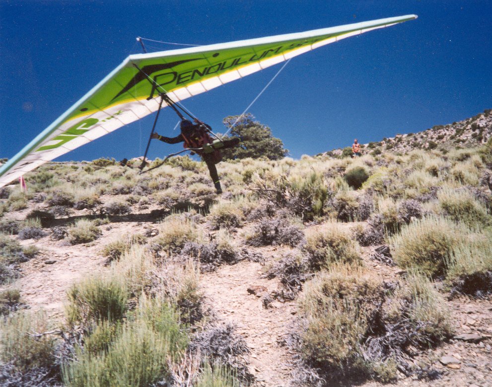 This is Gerry Charlebois launching at Gunter in the Owens Valley. Hit by turbulence well into his launch run, Gerry did not give up; but made full-scale correction to bring that tip back up. Believe it or not he recovered from this hairy situation and got into the air safely.