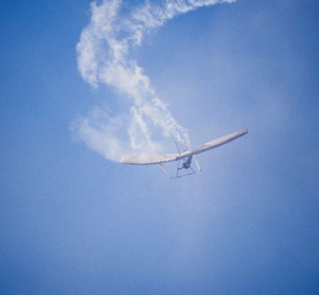 Notice the twisting-up of the trailing edge on the right wing as it is forced the wrong way through the air. Spins are hell on your sail. |